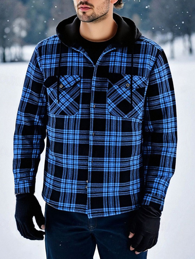 Men's Winter Coat Shirt Jacket Fleece Jacket Casual Jacket Casual Daily Thermal Warm Pocket Fall Winter Plaid Streetwear Daily Hooded Regular Blue Black White Red Dark Green Jacket