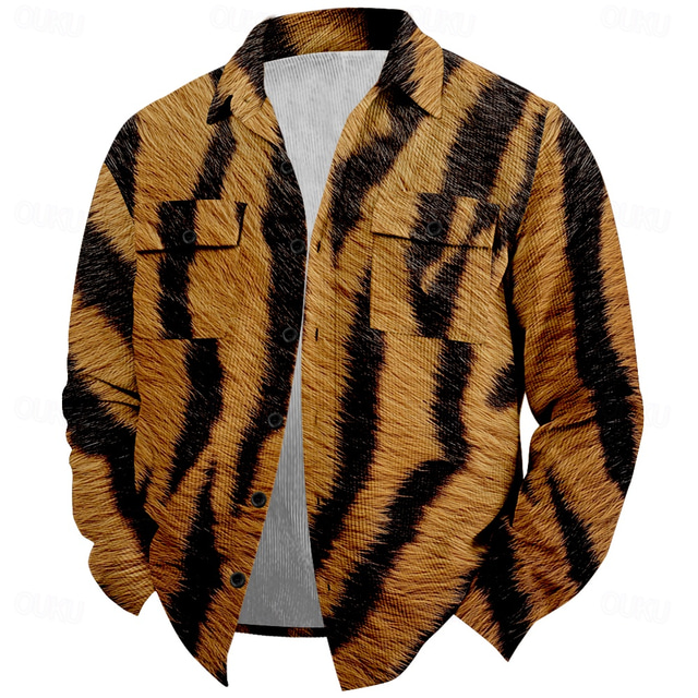 Men's Tiger Skin Corduroy Shirt Shirt Jacket Overshirt Long Sleeve Vintage Tribal Outdoor Dailywear Fall & Winter Turndown Collared Shirts Buttons 3D Print 2 Pockets 1pc Brown