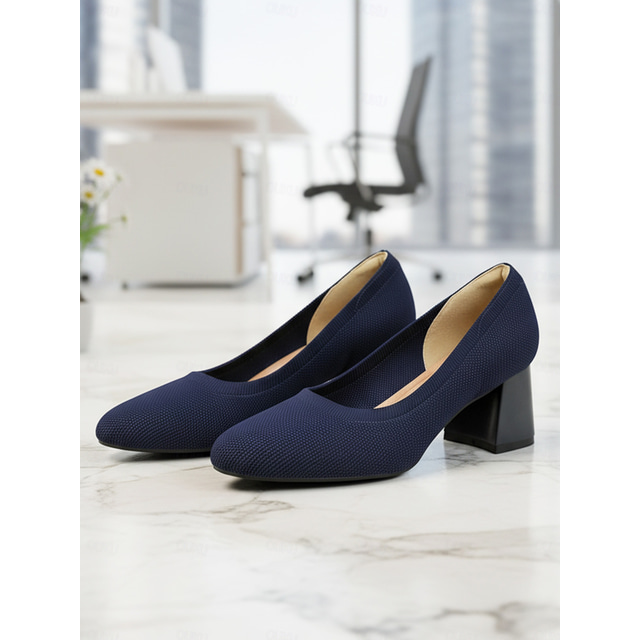 Women's Beige and Black Cap Toe Knit Pumps – Comfortable Block Heel Breathable Slip-On Shoes for Daily Business Commuting, Office Work & Professional Ladies
