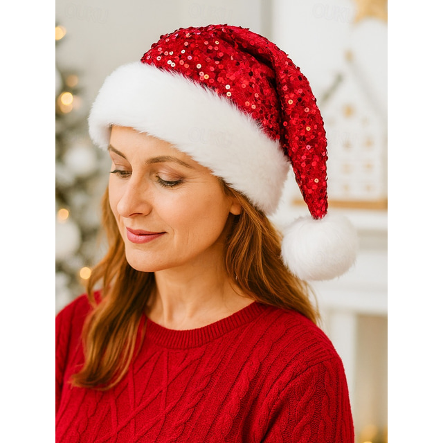 Women's Christmas Sequin Santa Hat, Red and Green Sequin Design with White Faux Fur, Festive Holiday Accessory for Christmas Parties and Celebrations