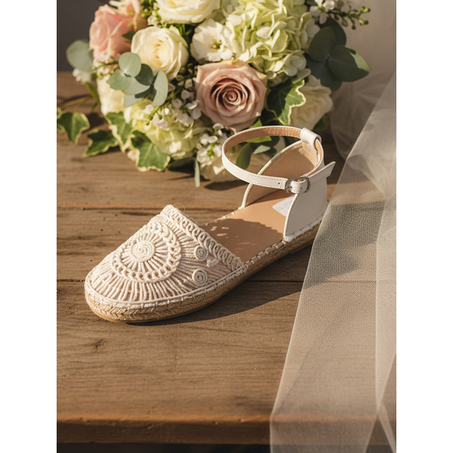 Women's White Lace Espadrille Flat Sandals – Boho Bridesmaid Shoes for Beach Weddings, Comfortable Crochet Closed-Toe Design for Outdoor Ceremonies