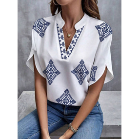 Blusa de mujer con cuello en V gráfico geométrico estilo playa de manga corta tops regulares para diario print azul verano primavera