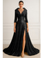 Funda Columna Hasta el Suelo Vestido de Lentejuelas Vestido de Madrina Manga Larga Escote en Pico Elegante Satén Lentejuelas con Cinta / Lazo