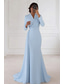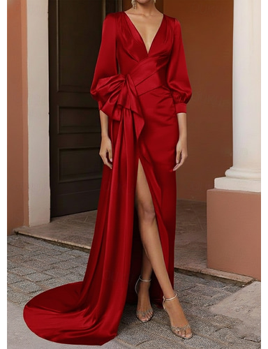 Corte Trompeta Sirena Cola de Corte Hasta el Suelo Vestidos de noche Elegante Estilo de Celebridad Manga Larga Escote en Pico Fiesta de jardin Boda Satén con Plisado Fruncido Abertura
