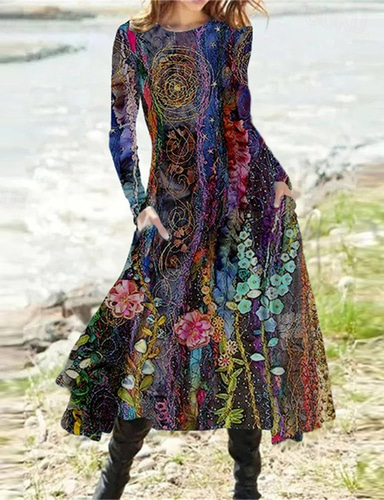 Mujer Vestido Midi Vestido a media pierna Vestido informal Vestido de invierno Vestido Étnico Vacaciones Casual Modesto Diario Exterior Trabajo Ajuste regular Floral Manga Larga Cuello Barco Morado