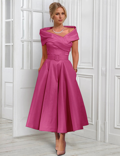 Corte A Vestido Midi Vestidos de coctel Vestidos de fiesta Elegante Sin Mangas Hombros Caídos Fiesta de jardin Boda Satén con Plisado