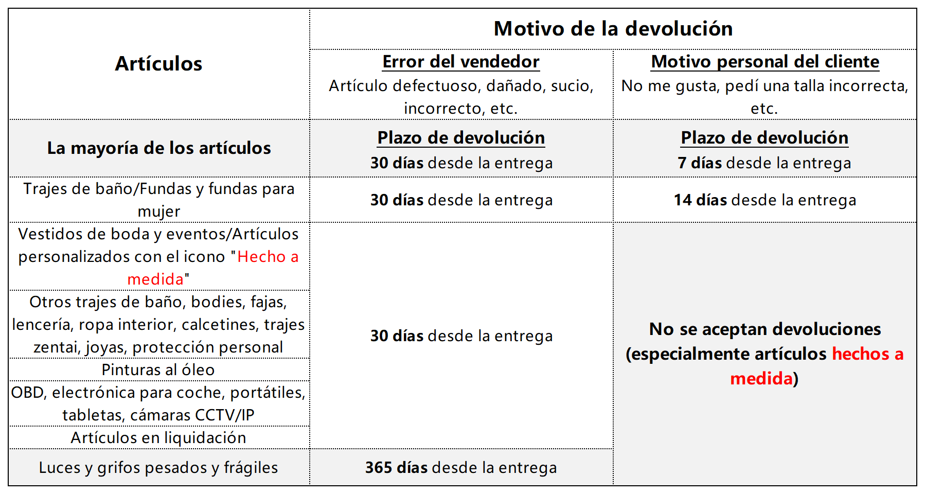 Excepto algunos productos hechos a medida, personalizados o especiales según lo requieran las leyes estatutarias aplicables en sus países o regiones locales, la gran mayoría de los productos pueden ser devueltos. Sin embargo, las condiciones específicas varían dependiendo del motivo de la devolución y el tipo de producto. Por favor, consulte la tabla a continuación para más detalles.