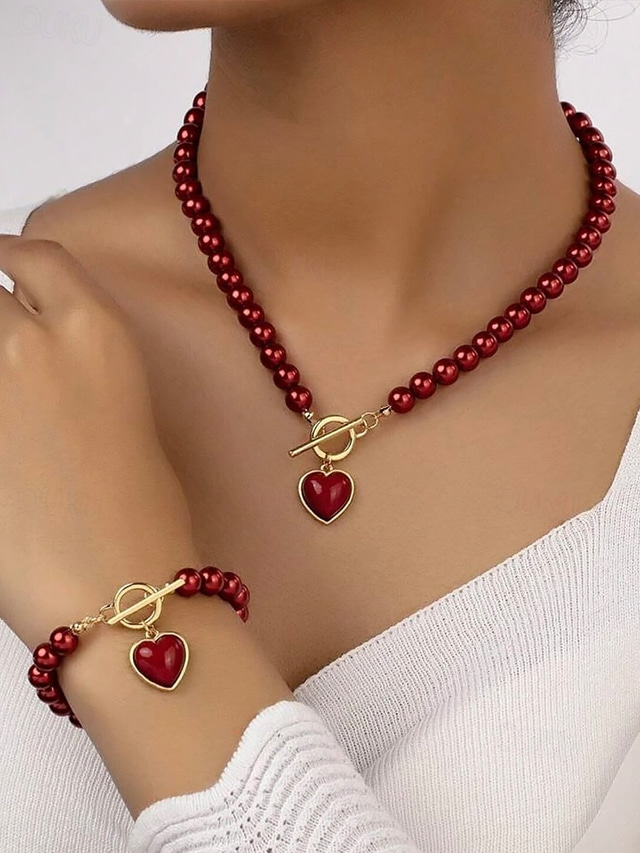 Conjunto de collar y pulsera de perlas rojas para mujer con colgante de corazón, diseño de cierre en tono dorado, joyería elegante para regalo de San Valentín, bodas y ocasiones especiales.