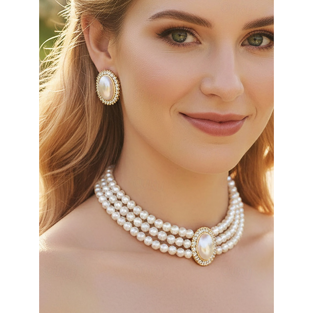 Conjunto de collar y pendientes de perlas artificiales para mujer, elegante gargantilla vintage multicapa con colgante ovalado, joyería nupcial clásica para bodas, fiestas nocturnas y eventos formales. 2026 - US $11.99 –P2