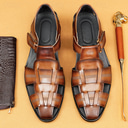 Sandalias de pescador de cuero marrón de lujo para hombre: elegante calzado de vestir con tiras tejidas |