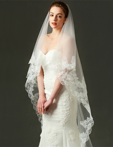 Kaksikerroksinen pitsi applikaatio reuna hääverho sormenpäähanskat applikaatioilla 37.4 in (95 cm) pitsi asu joka vaikuttaa