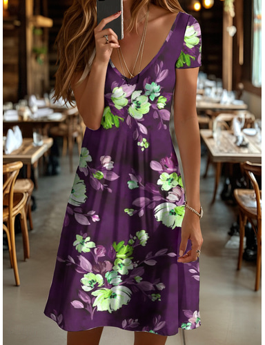 Naisten Mini mekko Rento mekko Tpaitamekko Kesämekko A linjainen mekko Loma Vapaa-aika Boheemi Hiekkaranta Normaali Kukka Kuvitettu Lyhythihainen V kaula-aukko Sininen Rubiini Purppura Ruskea Kes