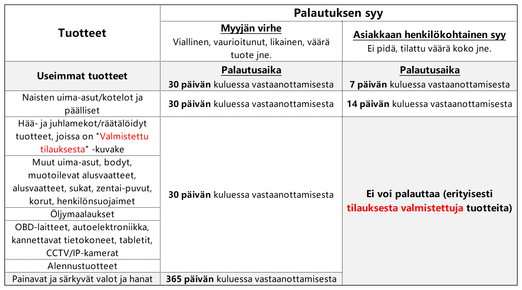 ukuun ottamatta joitakin tilaustuotteita, räätälöityjä tai erikoistuotteita, jotka on määrätty sovellettavien lakisääteisten lakien mukaisesti paikallisissa maissa tai alueilla, valtaosa tuotteista voidaan palauttaa. Kuitenkin tarkat ehdot vaihtelevat palautuksen syyn ja tuotetyypin mukaan. Katso taulukko alla olevista tiedoista.