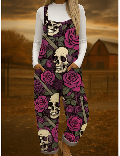 Salopette pour femmes 100% coton légère Graphique sans manches Larges jambes Col rond avec poche Vacances Quotidien Coupe ample Rouge Bleu Violet Été