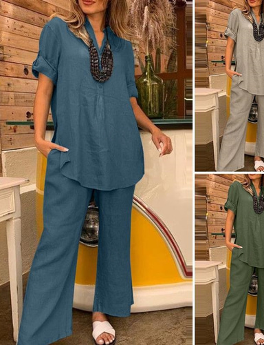 Femmes Chemise Ensembles inspirés du lin Ensembles deux pièces Pantalons en Lin Pantalons Manche Courte Col en V Couleur Unie Mode Streetwear Tenue quotidienne Date Vert Kaki Bleu clair Printemps