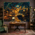 Tapisserie murale fantastique représentant un arbre magique, une bibliothèque, une cabane dans les arbres antique, une étagère murale, un escalier en colimaçon, une œuvre d'art lumineuse et