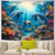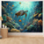 Tapisserie murale représentant une tortue marine, un récif corallien sous-marin et un paysage marin, idéale pour décorer une chambre, une salle de bain ou un salon.