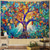 Tapisserie murale en vitrail coloré représentant l'arbre de vie, motif mosaïque arc-en-ciel vibrant, soleil radieux, paysage de montagne, pour chambre, salon, bureau, dortoir, etc.