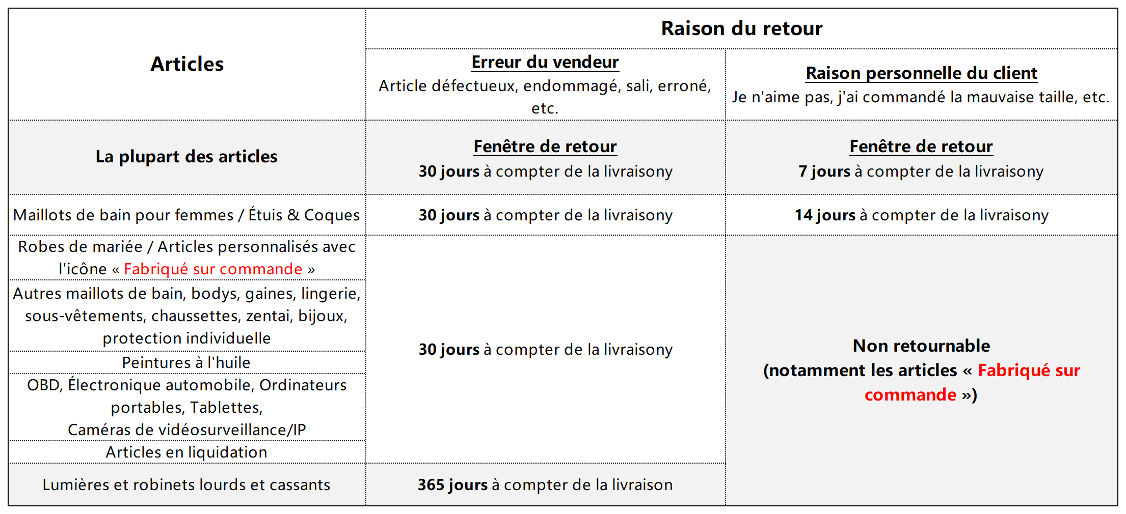 À l'exception de certains produits sur mesure, personnalisés ou spéciaux, comme l'exigent les lois applicables dans vos pays ou régions locaux, la grande majorité des produits peuvent être retournés. Cependant, les conditions spécifiques varient en fonction du motif du retour et du type de produit. Veuillez vous référer au tableau ci-dessous pour plus de détails.