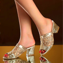 mules à talons épais en dentelle dorée pailletée pour femmes – sandales élégantes à bout ouvert pour les fêtes et les soirées