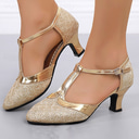 chaussures de danse à bride en T à paillettes dorées pour femmes, talons bas et talons moyens, talons de performance latine de salle de bal pour la salsa et le tango |