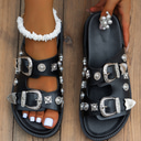 sandales à enfiler noires d'inspiration occidentale pour femmes - sandales à lanières ornées de boucles argentées pour des tenues d'été bohèmes et décontractées |