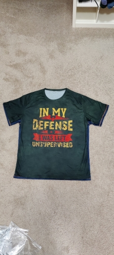 Printed quote is clean and crisp. This T-shirt appears to be a standard U.S. Mens Large, which is what I ordered. Sizing is inconsistent, though. I bought 4 T-shirts all Size Large. Two run large, more like an XL, and another one is more fitted than this T-shirt. Order your usual size. Be aware that this is polyester, and the texture is slick, unlike cotton. Printed quote is clean and crisp. This T-shirt appears to be a standard U.S. Mens Large, which is what I ordered. Sizing is inconsistent, though. I bought 4 T-shirts all Size Large. Two run large, more like an XL, and another one is more fitted than this T-shirt. Order your usual size. Be aware that this is polyester, and the texture is slick, unlike cotton.