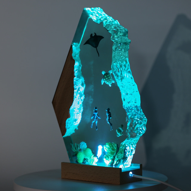 [Σημεία Σχεδίου] Αυτός ο διακοσμητικός λαμπτήρας διαθέτει μια μοναδική υποβρύχια σκηνή κλειδωμένη μέσα στη ρητινένια θήκη του. Οι περίπλοκες λεπτομέρειες, συμπεριλαμβανομένων μικροσκοπικών δυτών, χελωνών και σημαιών που κολυμπούν ανάμεσα σε κοραλλιογενείς ύφαλους, φωτίζονται από ένα μπλε LED φως, δημιουργώντας μια γοητευτική θαλάσσια λάμψη. Η καλλιτεχνική μορφή του λαμπτήρα, που θυμίζει φυσικές γεωλογικές σχηματισμούς, rests σε μια στέρεη ξύλινη βάση που προστίθεται ζεστασιά και οργανική ομορφιά στο συνολικό σχέδιο.