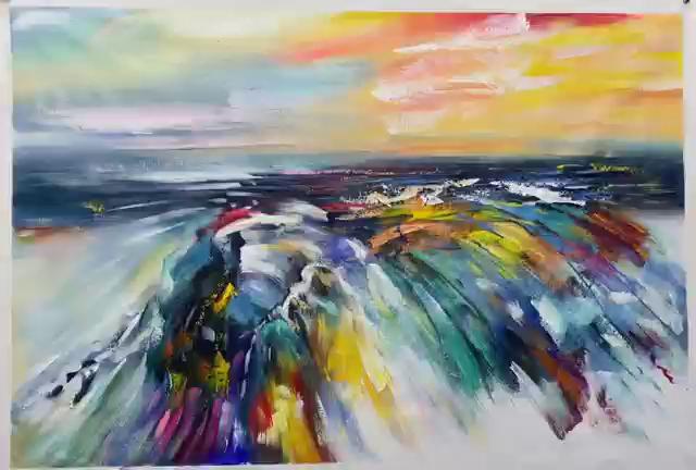 [Ύφασμα & Κατασκευή]: Αυτό το ζωντανό αφηρημένο έργο τέχνης είναι φτιαγμένο σε υψηλής ποιότητας τυλιγμένο καμβά, προσφέροντας μια ανθεκτική και πολυτελή υφή που ενισχύει τη ζωντάνια της ελαιογραφίας. Ο ζωντανός συνδυασμός μπλε, πορτοκαλί, κίτρινου και πράσινου δείχνει την ικανότητα του καλλιτέχνη να συνδυάζει και να στρώνει χρώματα, δημιουργώντας ένα τολμηρό και εκφραστικό κομμάτι.