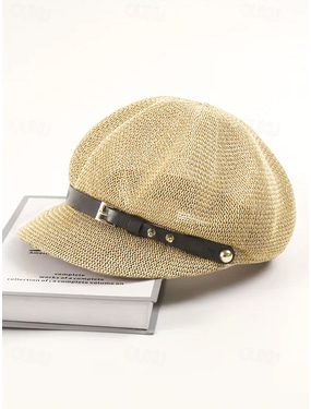 כובע קש נושם לנשים - כובע חוף קיץ קל משקל עם אבזם דמוי עור לנסיעות מזדמנות והגנה מפני השמש