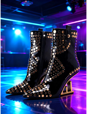 מגפוני קרסול שחורים עם עקבים משובצים לנשים - מגפונים אופנתיים עם חרטום מחודד ועקב זהב מטאלי לבילוי לילי, מועדונים ומסיבות