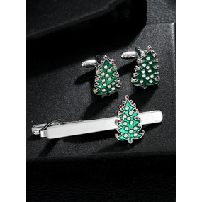 סט חפתים וסיכות לעניבה לגברים עם עץ חג המולד - סט תכשיטי חג חגיגי עם אמייל ירוק וקריסטלים למסיבות חג המולד ואירועים מיוחדים