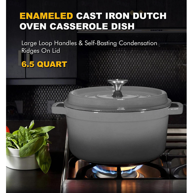 סיר בישול אובלי מברזל יצוק עם מכסה טפטוף אפור בהיר