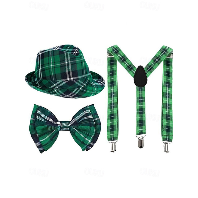 סט אביזרי תחפושת ליום פטריק הקדוש לגברים, סט פפיון וכתפיות כובע משובץ ירוק, בד פוליאסטר עם דוגמאות מרובות, תלבושת למצעד ומסיבה אירית לגברים