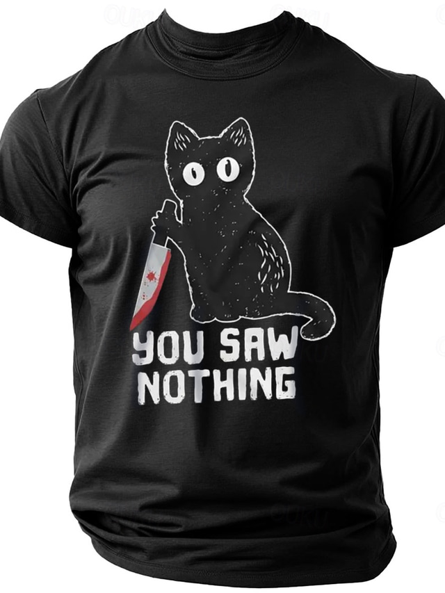 חולצת טי מצחיקה לגברים חתול עם סכין 'לא ראית כלום' עם גרפיקה הומור כהה