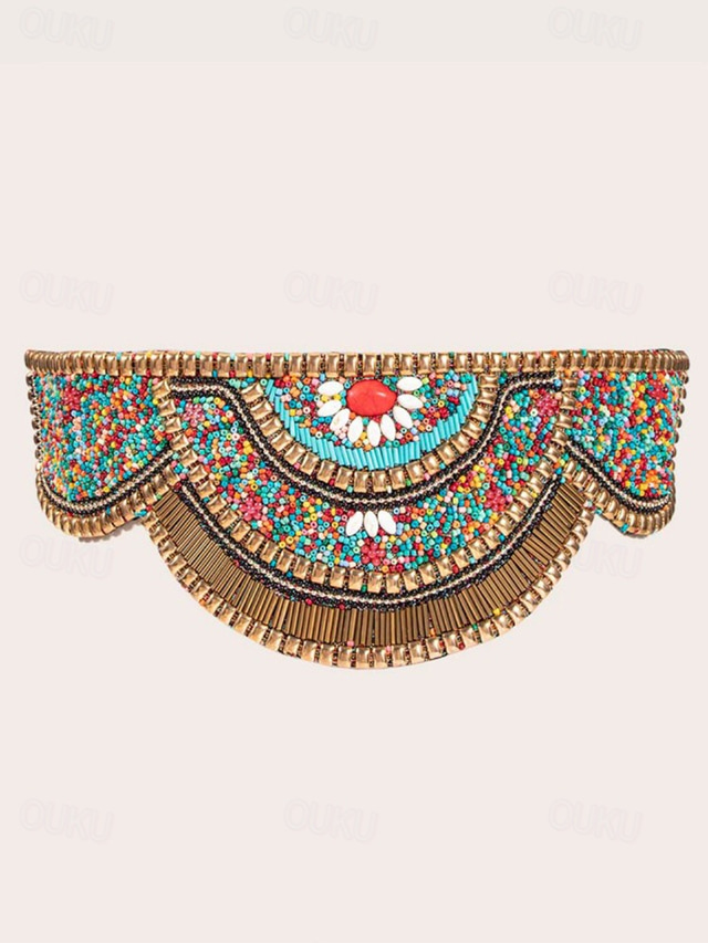 חגורת חרוזים בעבודת יד בסגנון בוהמייני לנשים, גומייה נמתחת עם גדילים ותליונים - עיצוב רקום צבעוני לנשים, מושלם לחוף הים, פסטיבלים ואירועי קיץ