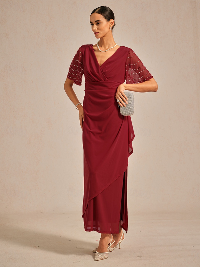 בגדי ריקוד נשים שמלת מקסי שמלה בגזרה ישרה אלגנטית מסיבת ערב אורחת חתונה מסיבת קוקטייל רגיל צבע אחיד שרוולים קצרים צווארון V אודם