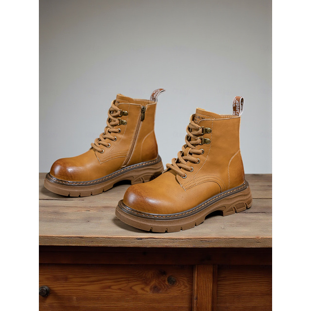מגפי קרסול לנשים עם שרוכים, רוכסן צד וסוליה עבה נגד החלקה - מגפי עבודה בסגנון קרבי לטיולים ולחורף
