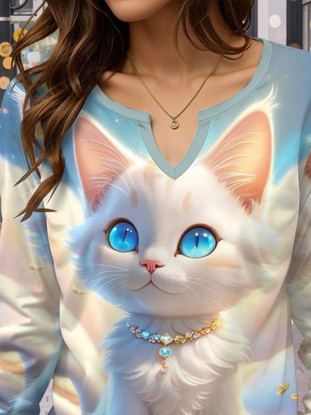 בגדי ריקוד נשים חולצה קצרה דפוס חתול יום יומי שרוול ארוך צוואר מחורץ חולצות רגילות יומי חופשה פול קיץ & אביב