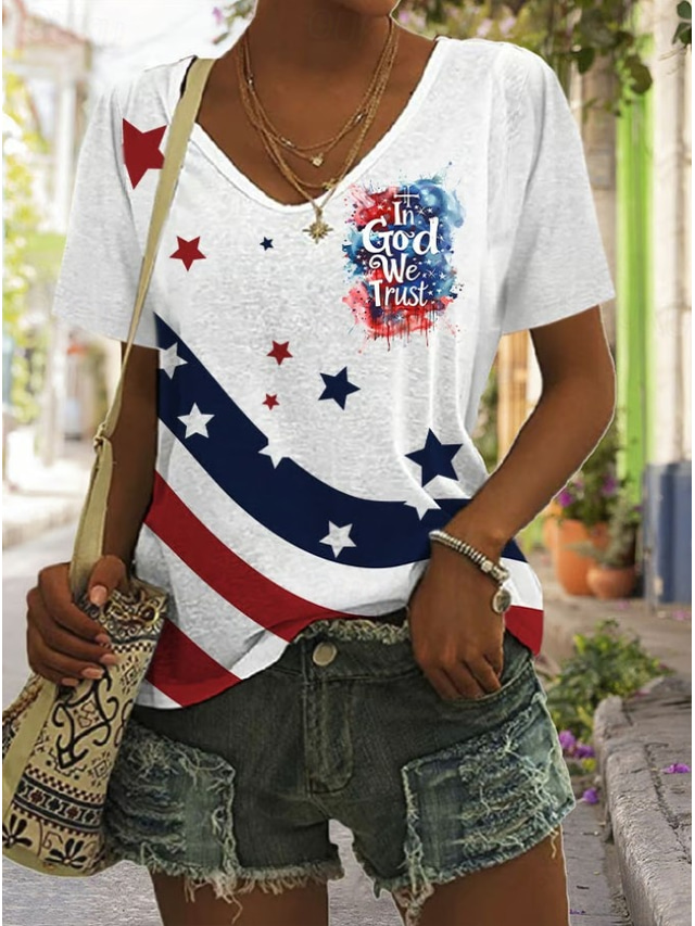 יום העצמאות האמריקאי בגדי ריקוד נשים חולצה קצרה דפוס גראפי דגל וינטאג' מסוגנן קלסי שרוולים קצרים צווארון V חולצות רגילות יומי פול בז' בהיר שחור לבן ורוד מסמיק קיץ אביב