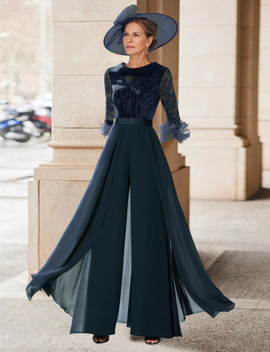 Nadrág Hosszú Örömanya ruha Háromnegyedes Kanálnyak Elegáns Buli Előírásos Esküvői vendég Sifon Csipke val vel Rátétek