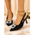 női pöttyös magassarkú cipők - elegáns fekete-fehér slingback magassarkú masnival &gyöngyös részletek vintage partikra, rockabilly rendezvényekre &klasszikus irodai viselet