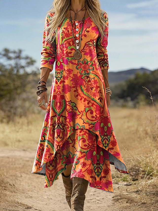 Női Midi Ruha Boho Shift Ruha Vakáció Causal Napi Ünnepi Normál Fit Grafikus Geometrikus Hosszú Ujjú Kerek Nyakú V Nyakú Fekete Piros Narancs Sötétkék Nyár Tavasz Ősz