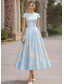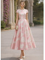 Linea ad A Lunghezza Tè Abiti da Cocktail Abiti per invitati a matrimoni Elegante Manica Corta Scollo a Barca Festa in giardino Formale Raso Pizzo con Stampa floreale Pieghe Arricciato