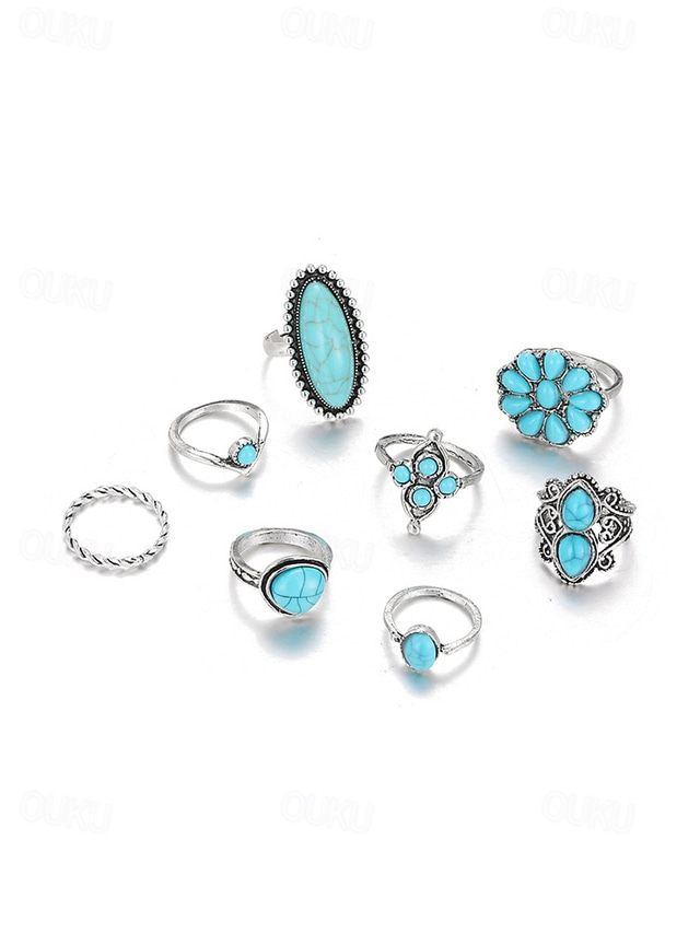 Set di anelli da donna in lega e turchese in stile bohémien, composto da 8 anelli vintage impilabili per le nocche, perfetti per le vacanze al mare, gli outfit estivi casual e l'abbigliamento boho di tutti i giorni.