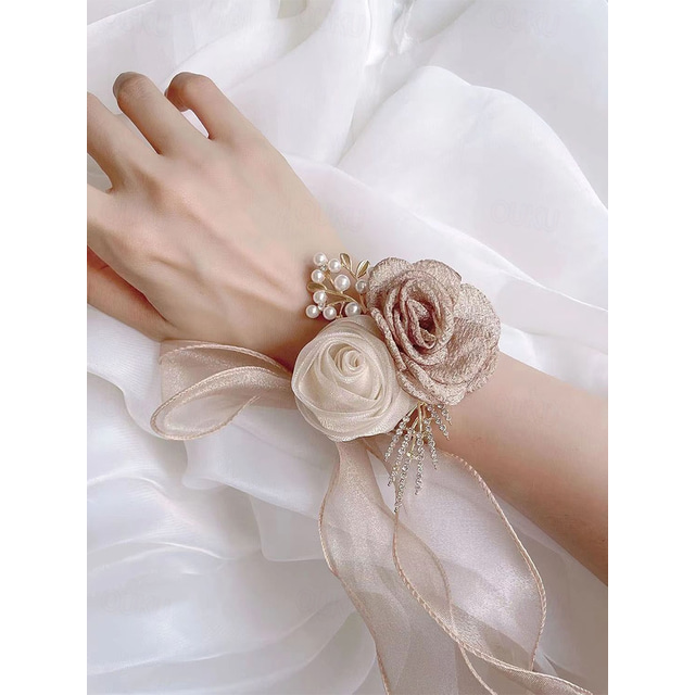 Set di fiori da sposa in poliestere da donna, fiore da polso per damigella d'onore color champagne e bianco e fiore all'occhiello per lo sposo, elegante stile romantico per cerimonie nuziali, fidanzamenti ed eventi formali