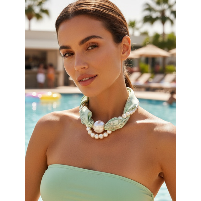 Collana con sciarpa magnetica in poliestere e perle finte da donna, design multicolore alla moda, abbigliamento casual quotidiano, da viaggio e da vacanza