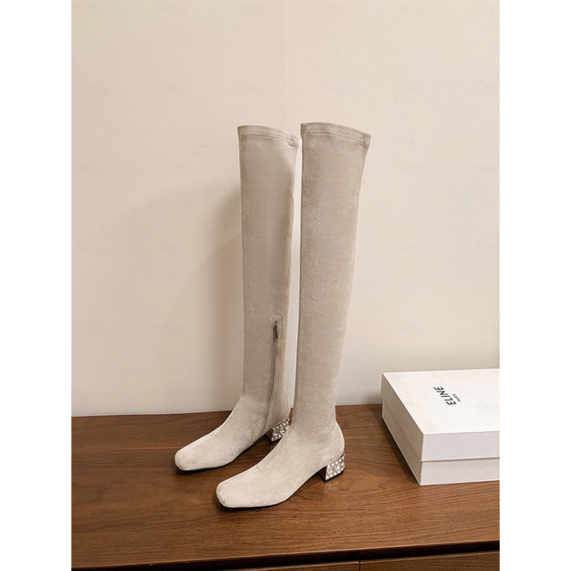 stivali da donna in pelle scamosciata sopra il ginocchio con tacco a blocco di strass, chiusura con cerniera, eleganti e raffinati per l'inverno o la sera