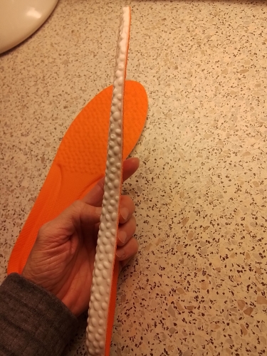 I have since reordered multiple colors of these unique memory foam inner soles, not only for tennis shoes. They have approximately 1/2-inch thickness at the heel, which is cupped. Yes, you can actually roll them up, they are that flexible unlike most thick, stiff sports models selling for around $20. I bought this pair for $2.99, but reordered others at $1.49. Sometimes out of stock; so consider that EU39 = US size 8, which can be trimed down , EU38 = US 7.5 I have since reordered multiple colors of these unique memory foam inner soles, not only for tennis shoes. They have approximately 1/2-inch thickness at the heel, which is cupped. Yes, you can actually roll them up, they are that flexible unlike most thick, stiff sports models selling for around $20. I bought this pair for $2.99, but reordered others at $1.49. Sometimes out of stock; so consider that EU39 = US size 8, which can be trimed down , EU38 = US 7.5