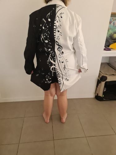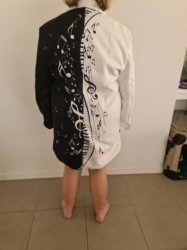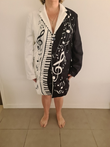 I love the outer soft feel like felt and the smoothness of the inner lining. Im a typical womens size 20 and this fit well even though its a little long in arms which is good as it keeps me warm and is a little tight across the shoulders though it is designed for a man. I just couldnt resist the pattern as a music teacher! I am more than happy with my purchase. The little intracacies such as the little black buttons on the sleezes, the split aat the back and the way the collar sits down perfectly are nice and it was quite warm to wear. I love the outer soft feel like felt and the smoothness of the inner lining. Im a typical womens size 20 and this fit well even though its a little long in arms which is good as it keeps me warm and is a little tight across the shoulders though it is designed for a man. I just couldnt resist the pattern as a music teacher! I am more than happy with my purchase. The little intracacies such as the little black buttons on the sleezes, the split aat the back and the way the collar sits down perfectly are nice and it was quite warm to wear.